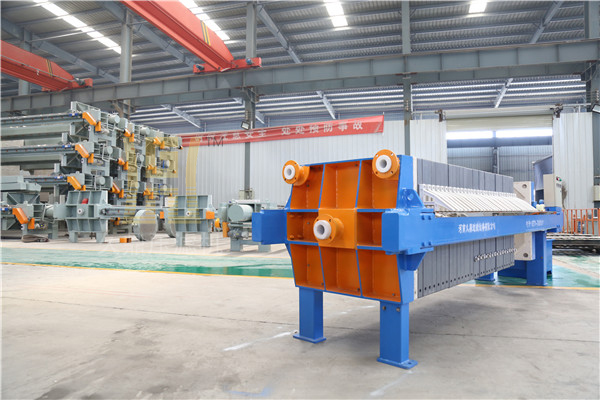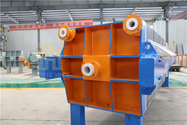 隔膜壓榨壓濾機由隔膜板和廂式濾板排列組成濾室,在輸料泵的壓力作用下將漿料輸入濾室,通過過濾介質(濾布)將漿料中的固體和液體分離,當固體形成濾餅后,向隔膜板通入高壓空氣,對濾室內的固體充分壓榨,降低濾餅含水率。對于粘性物料的過濾及含水率要求高的用戶,此機更有其獨特的特性。